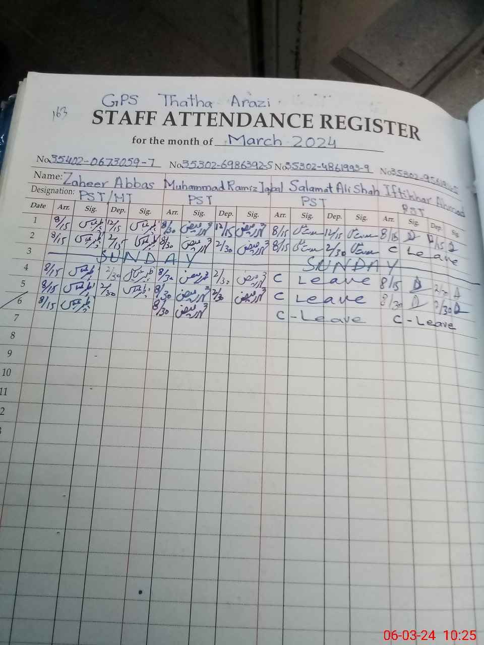 | CNIC | Full Name | Designation | R/C | Absence during last cal. month |