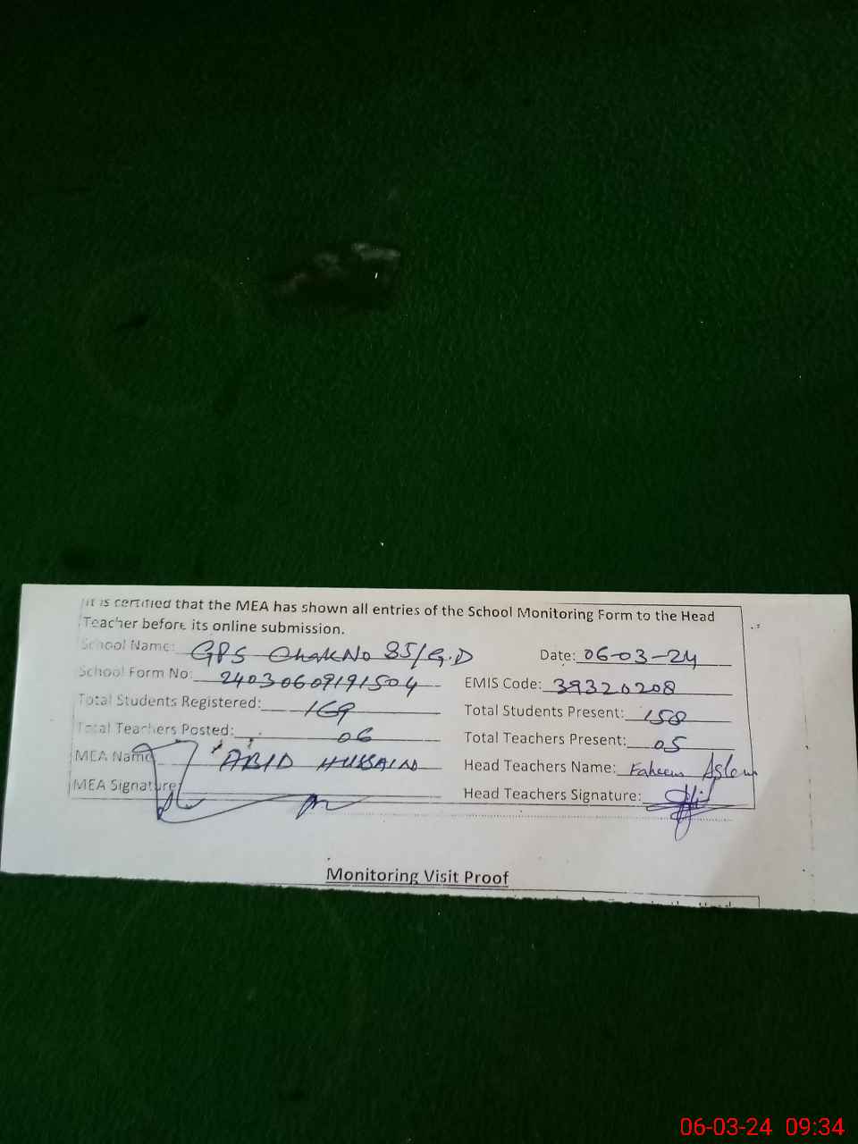 | Attendance Register | Head Teacher | MEA with School | Visit Proof |