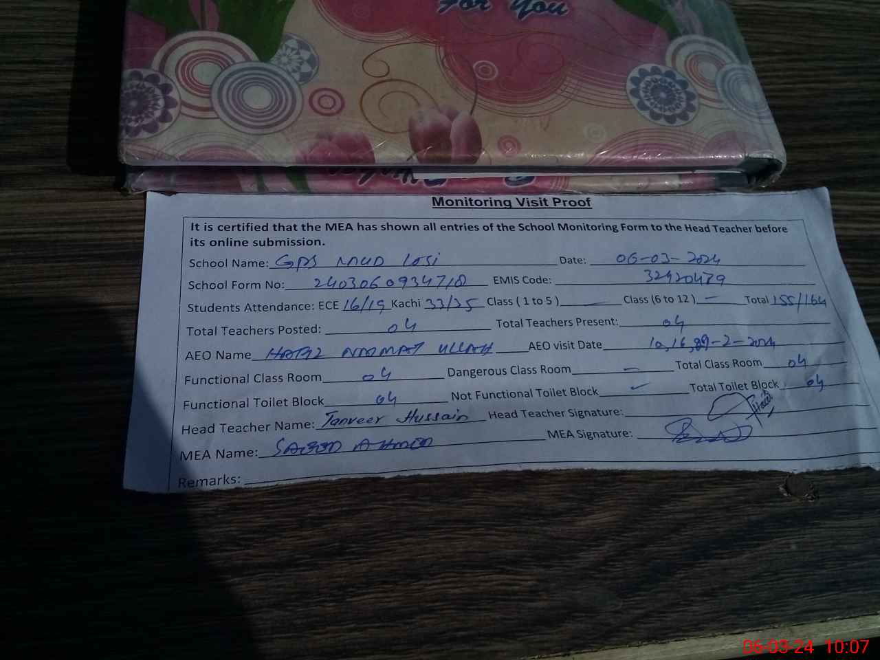 | Certified that this School was Inspected by the Undersigned MEA/DMO Today and the Information Stated Above is as Per Record. | |||||
