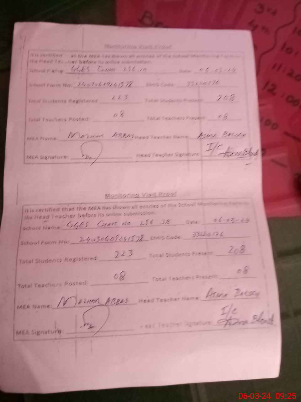 | Attendance Register | Head Teacher | MEA with School | Visit Proof |