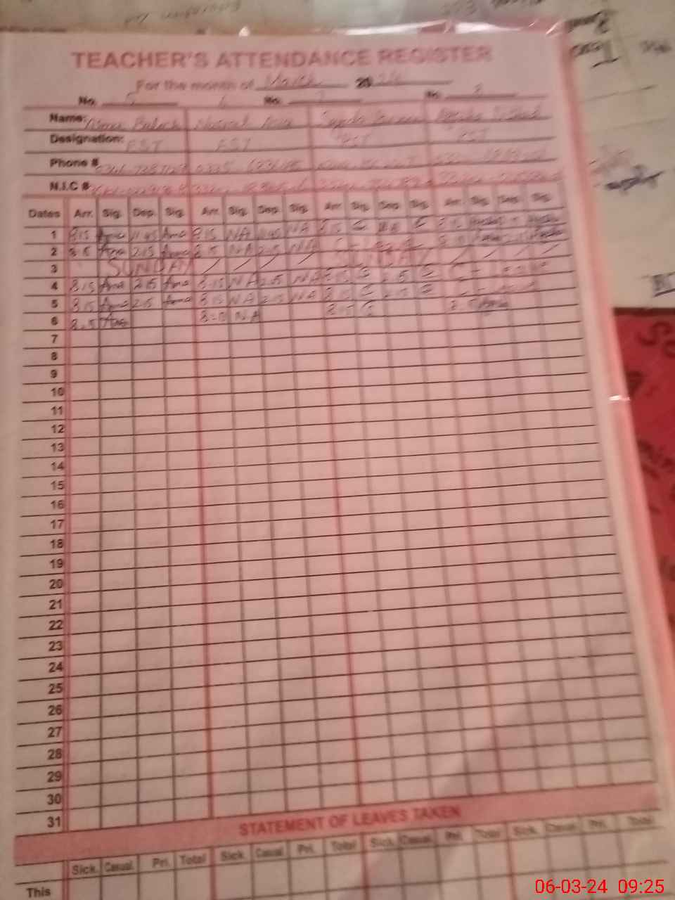 | Name: BA**** ZA**** Designation: (School Headmaster's/Headmistress's) SSE. ENG Phone/Cell Number: 03**** |