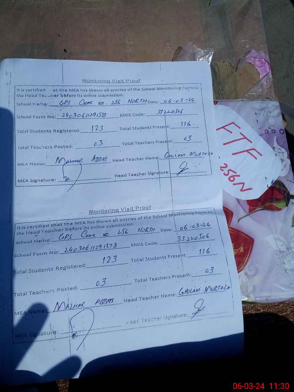 | EMIS Code: 33220506 | Name of School: GPS CHAK NO 256 JB NORTH | |||