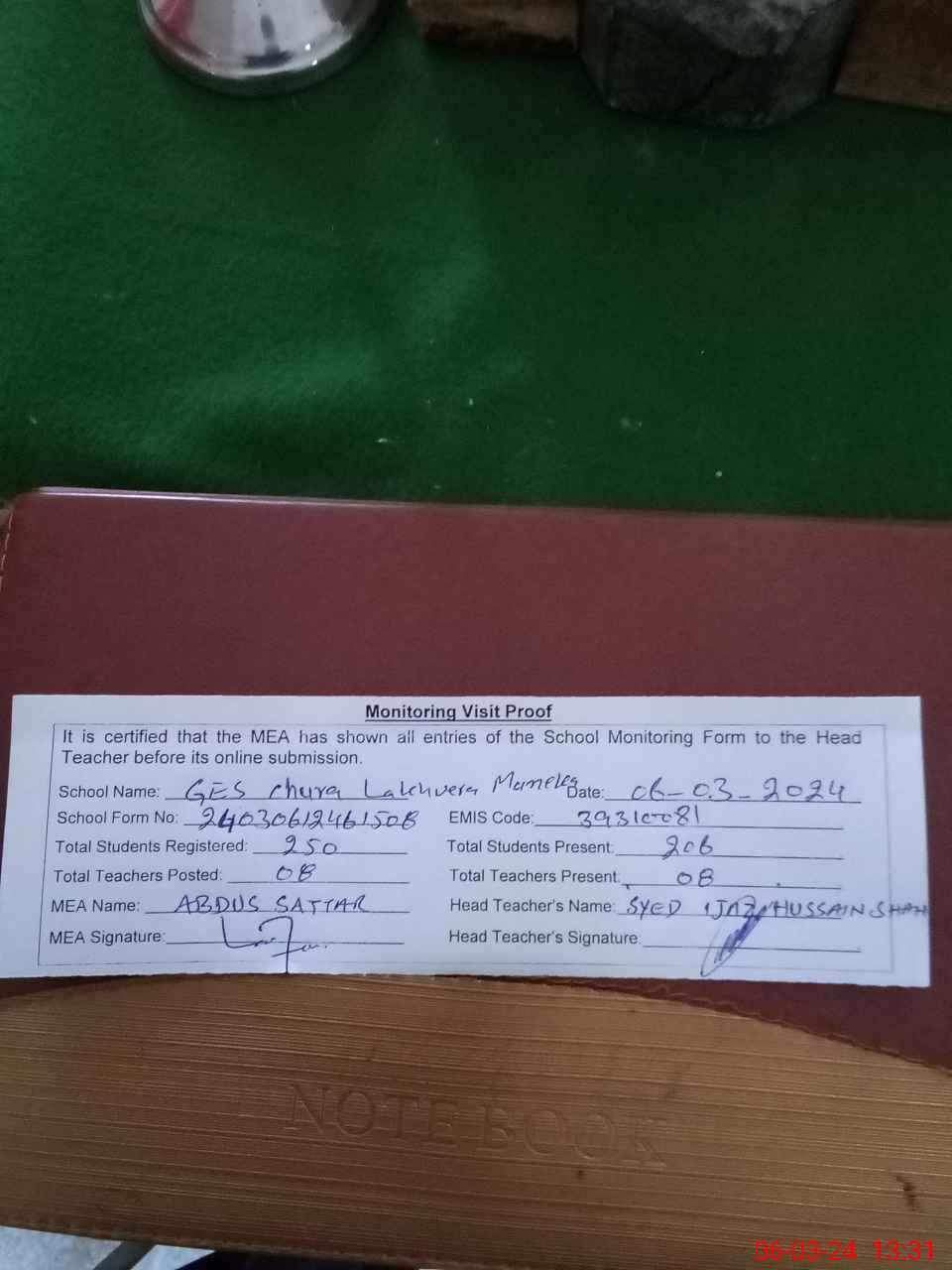 | Attendance Register | Head Teacher | MEA with School | Visit Proof |