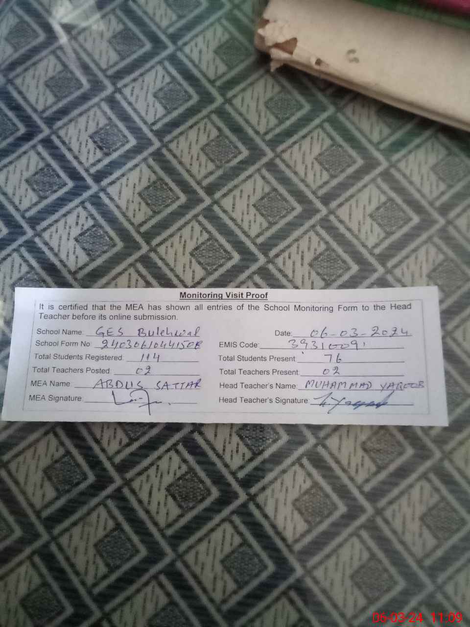 | EMIS Code: 39310091 | Name of School: GES BULEHWAL | |||