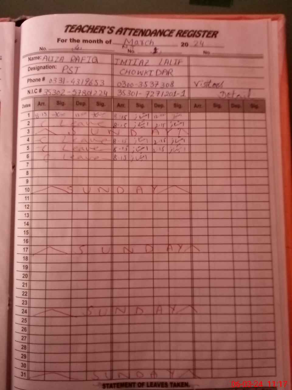 | CNIC | Full Name | Designation | R/C | Absence During Last Calender Month |