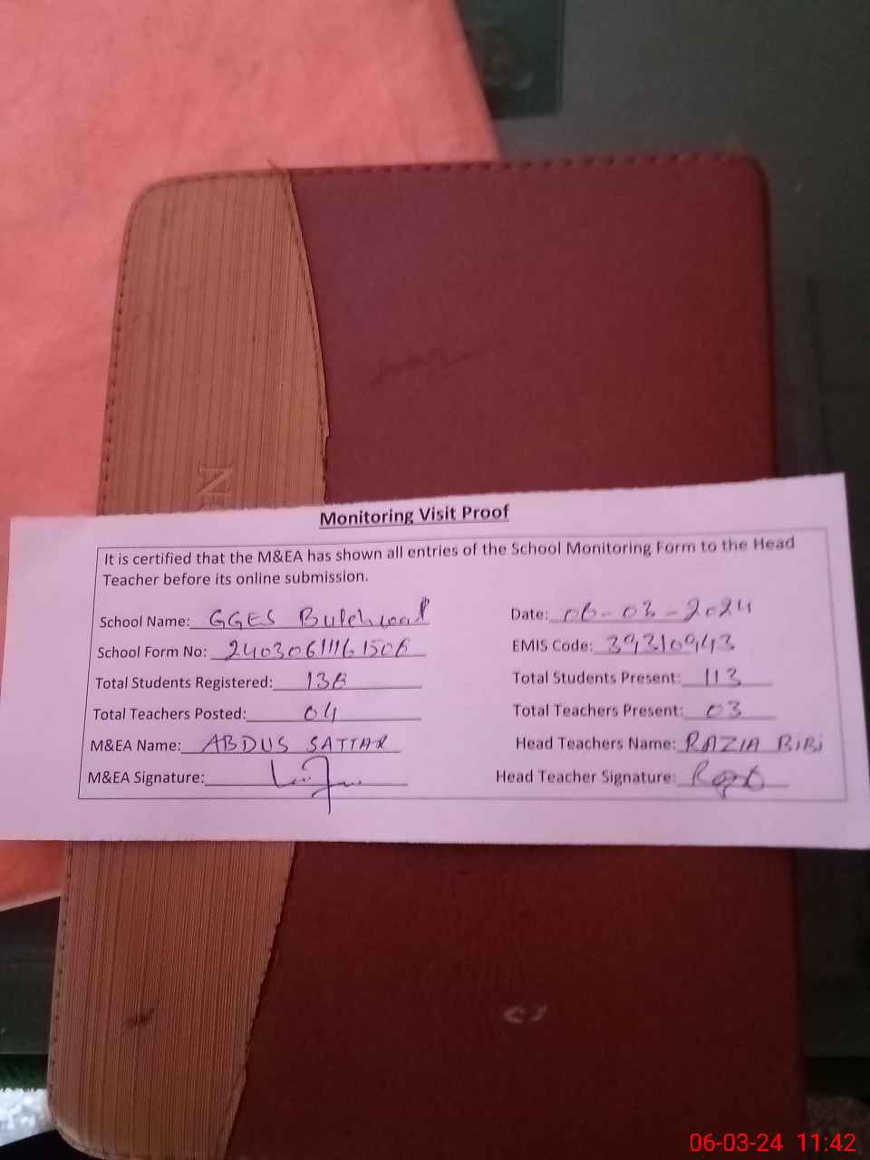 | Attendance Register | Head Teacher | MEA with School | Visit Proof |