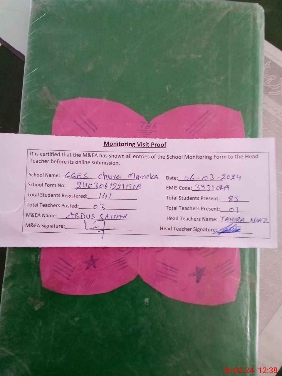 | Attendance Register | Head Teacher | MEA with School | Visit Proof |