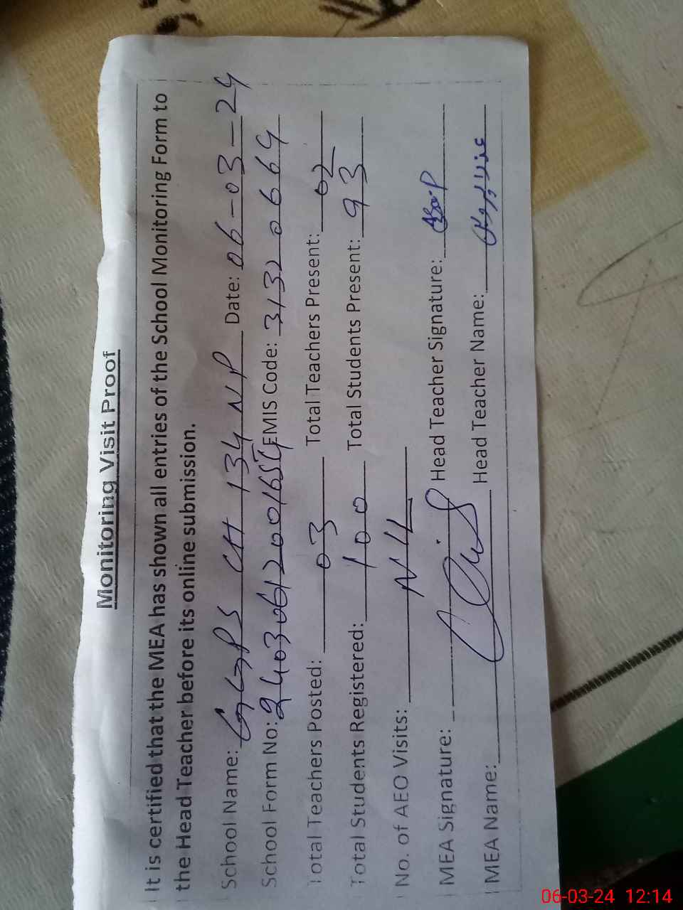 | Attendance Register | Head Teacher | MEA with School | Visit Proof |