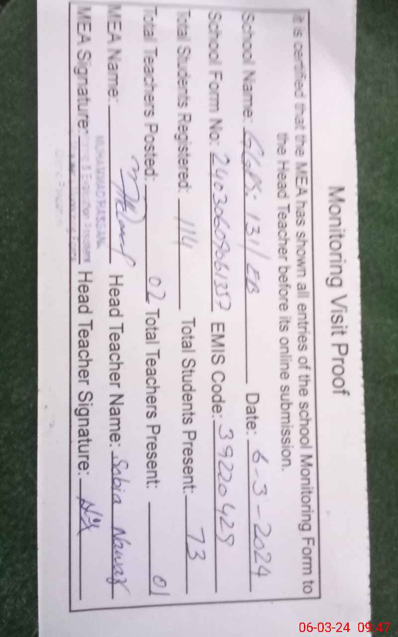 | Certified that this School was Inspected by the Undersigned MEA/DMO Today and the Information Stated Above is as Per Record. | |||||
