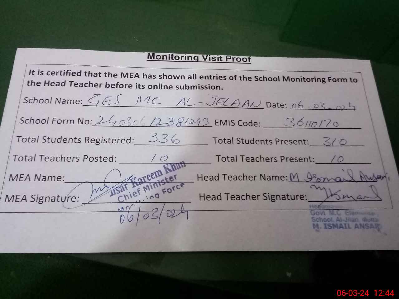 | Certified that this School was Inspected by the Undersigned MEA/DMO Today and the Information Stated Above is as Per Record. | |||||
