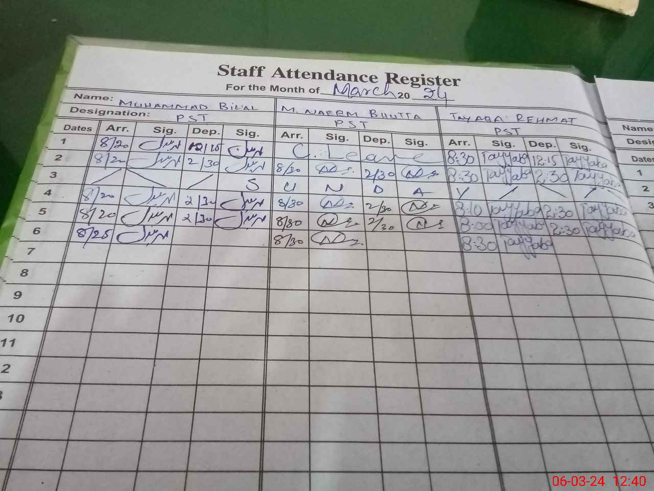 | CNIC | Full Name | Designation | R/C | Absence During Last Calender Month |