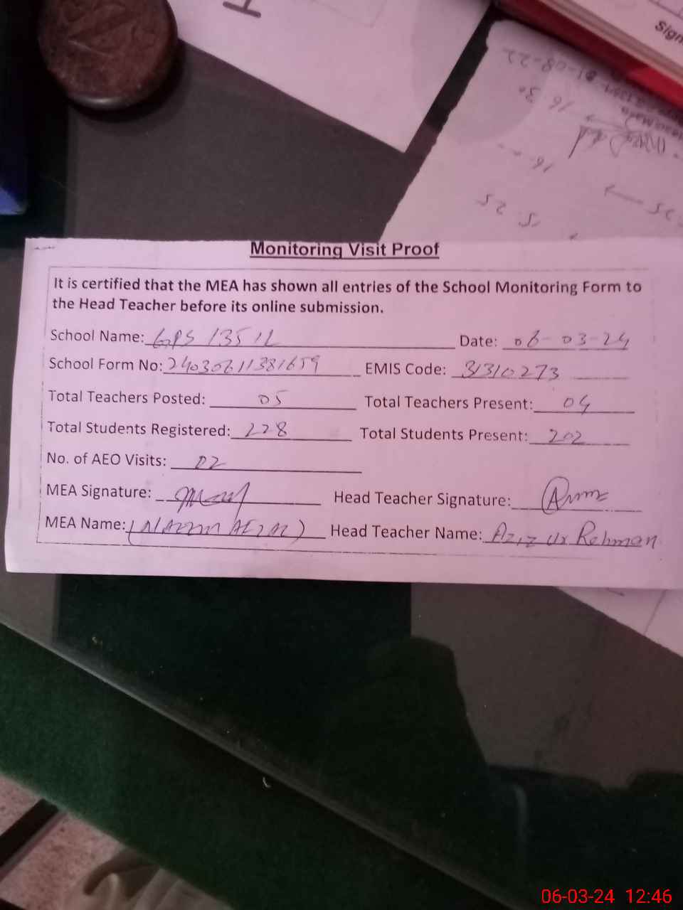 | Attendance Register | Head Teacher | MEA with School | Visit Proof |
