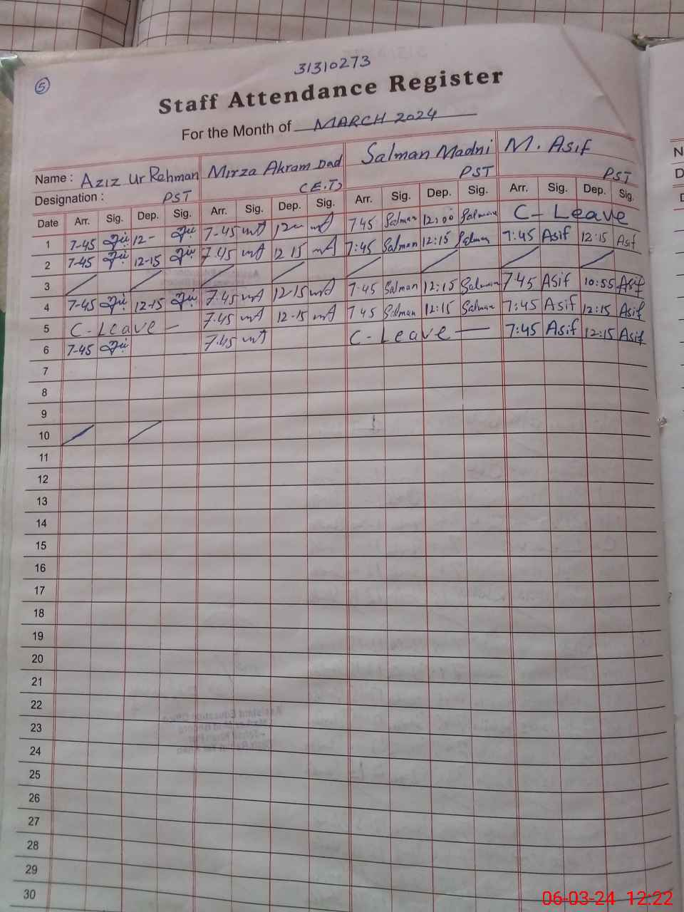 | CNIC | Full Name | Designation | R/C | Absence During Last Calender Month |