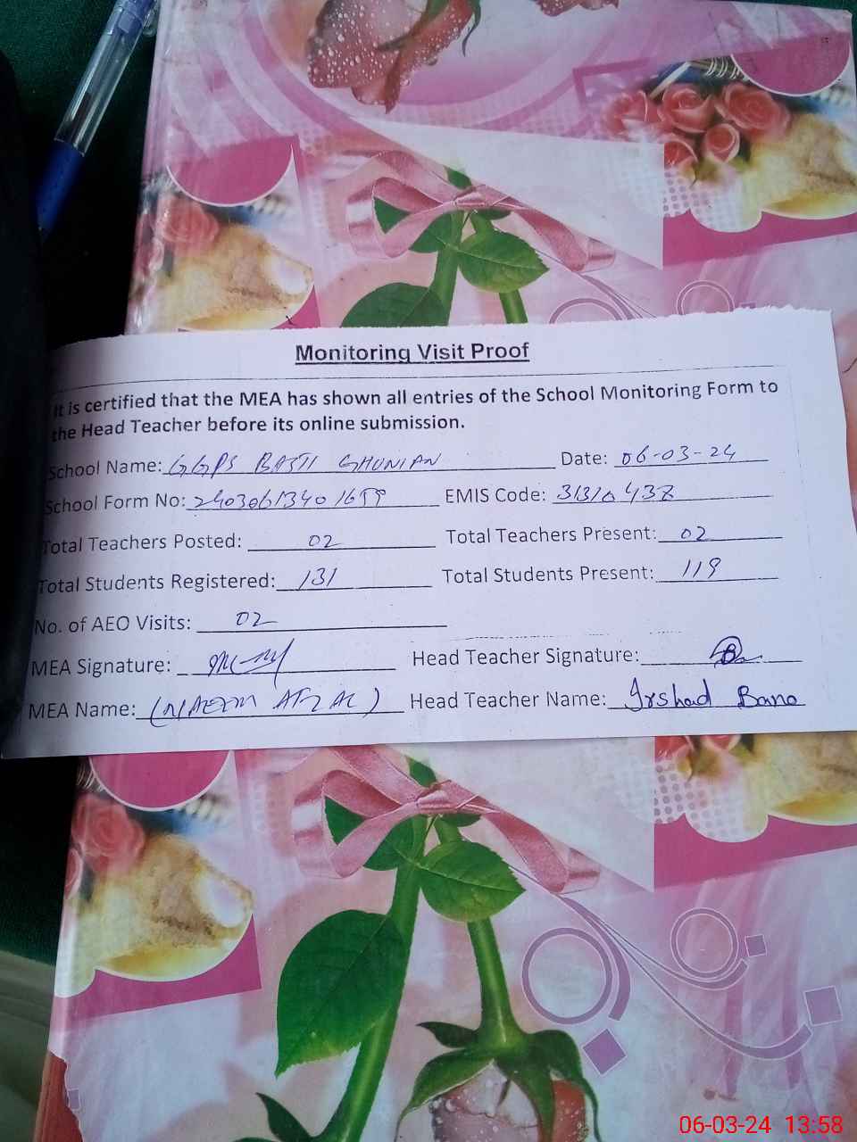 | Attendance Register | Head Teacher | MEA with School | Visit Proof |