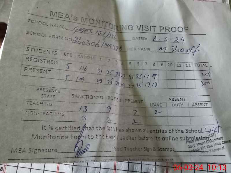 | EMIS Code: 36430302 | Name of School: GGES 121/15-L MIAN CHANNU | |||