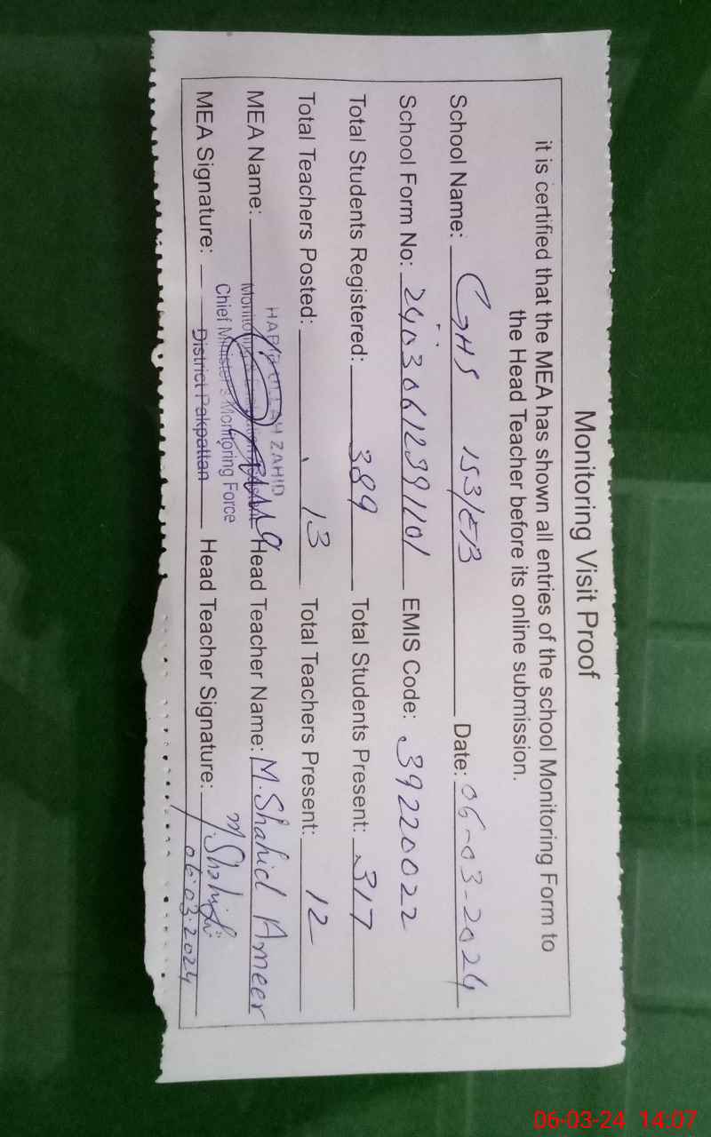 | EMIS Code: 39220022 | Name of School: GHS 153 EB | |||