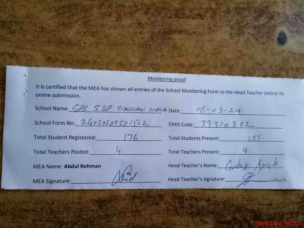 | Attendance Register | Head Teacher | MEA with School | Visit Proof |