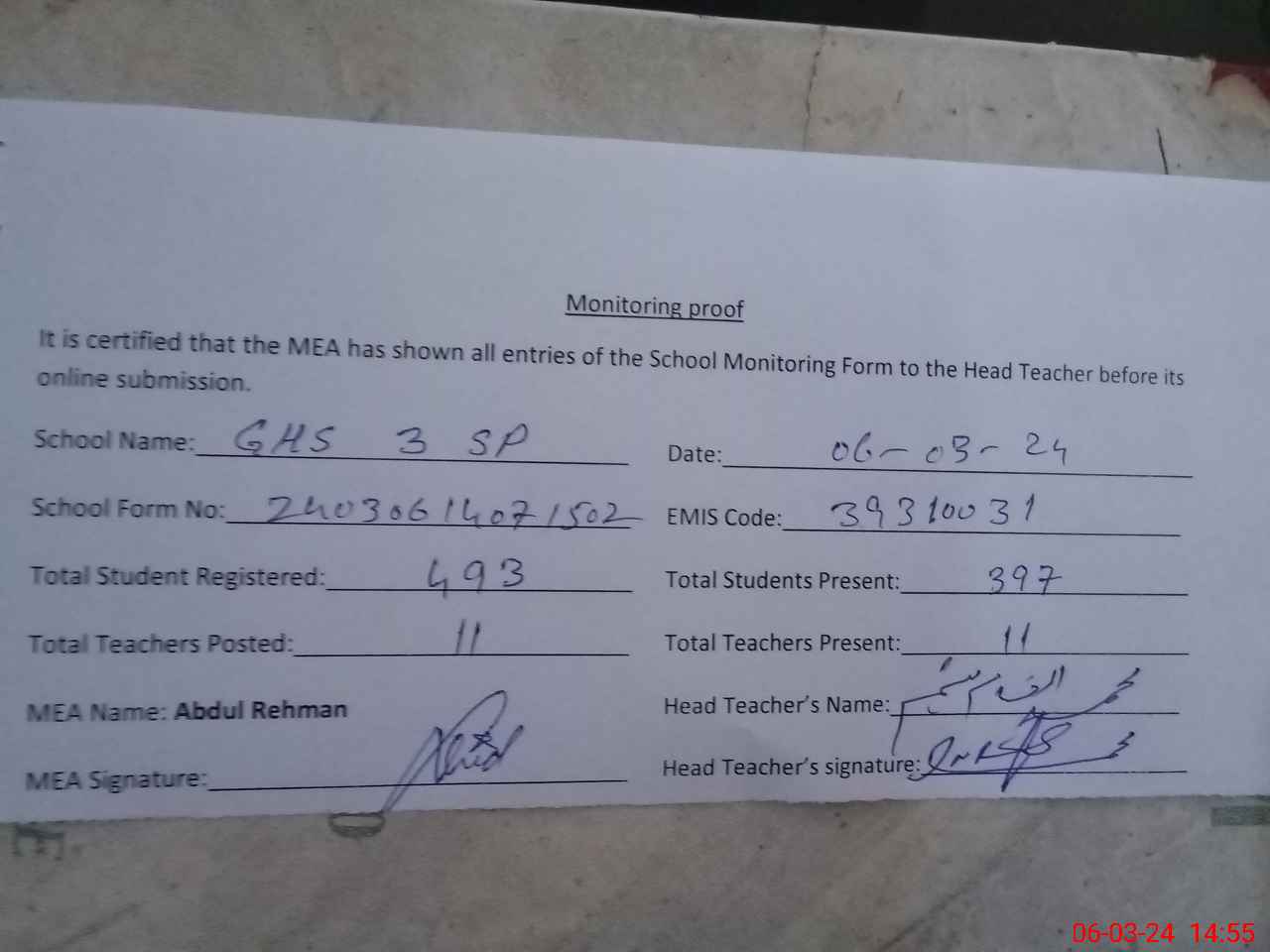 | EMIS Code: 39310031 | Name of School: GHS CHAK NO. 3/SP OKARA | |||