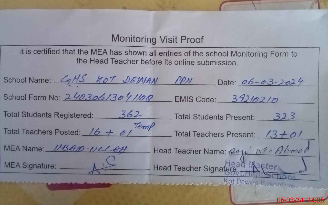 | EMIS Code: 39210210 | Name of School: GHS KOT DEWAN PO PAKPATTAN | |||