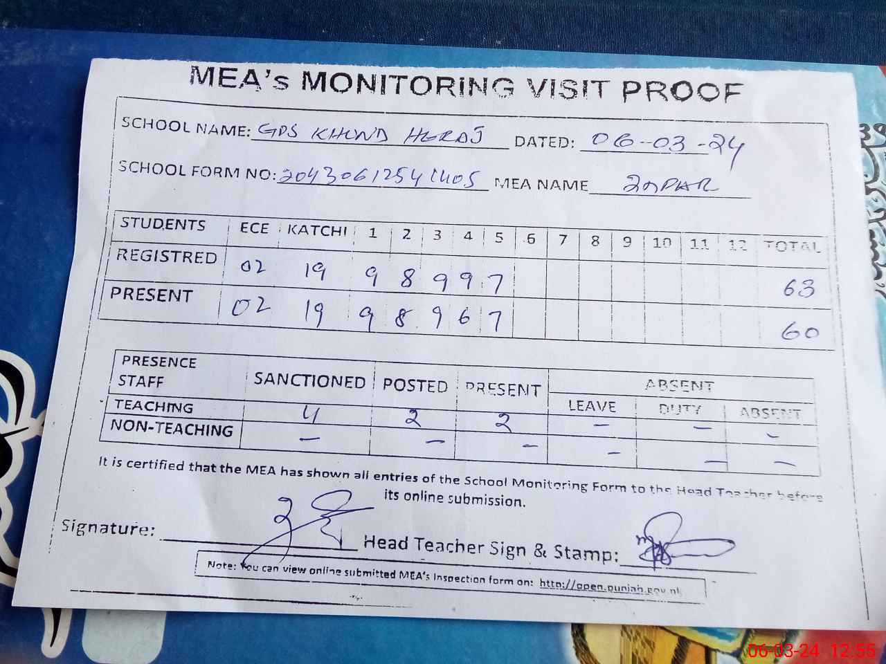 | Attendance Register | Head Teacher | MEA with School | Visit Proof |