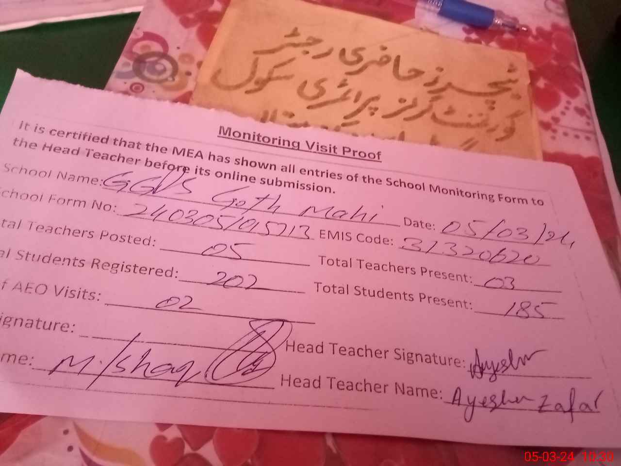 | EMIS Code: 31320620 | Name of School: GGPS GOTH MAHI | |||