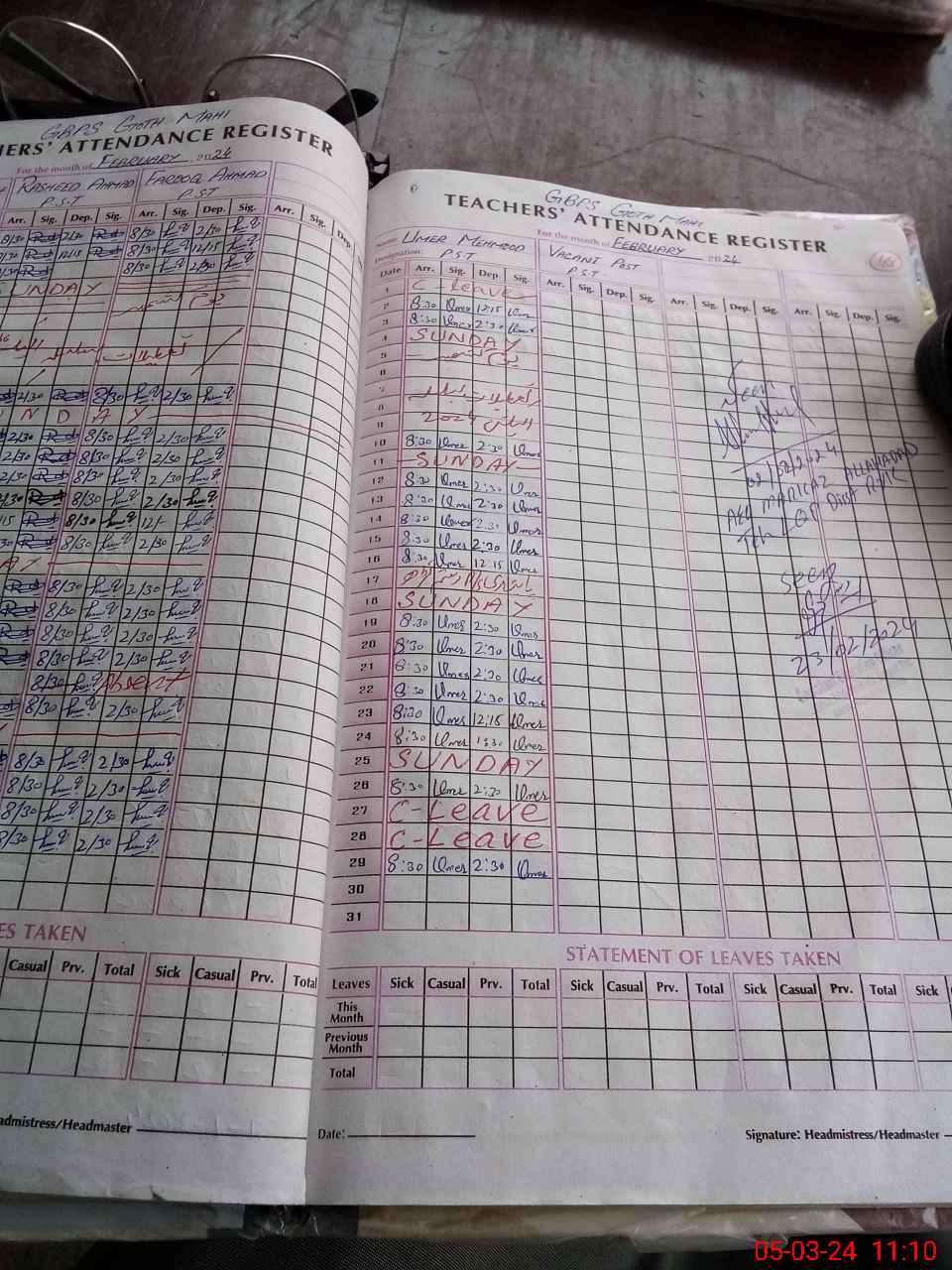 | Name: UM**** MA**** Designation: (School Headmaster's/Headmistress's) PST Phone/Cell Number: 03**** |