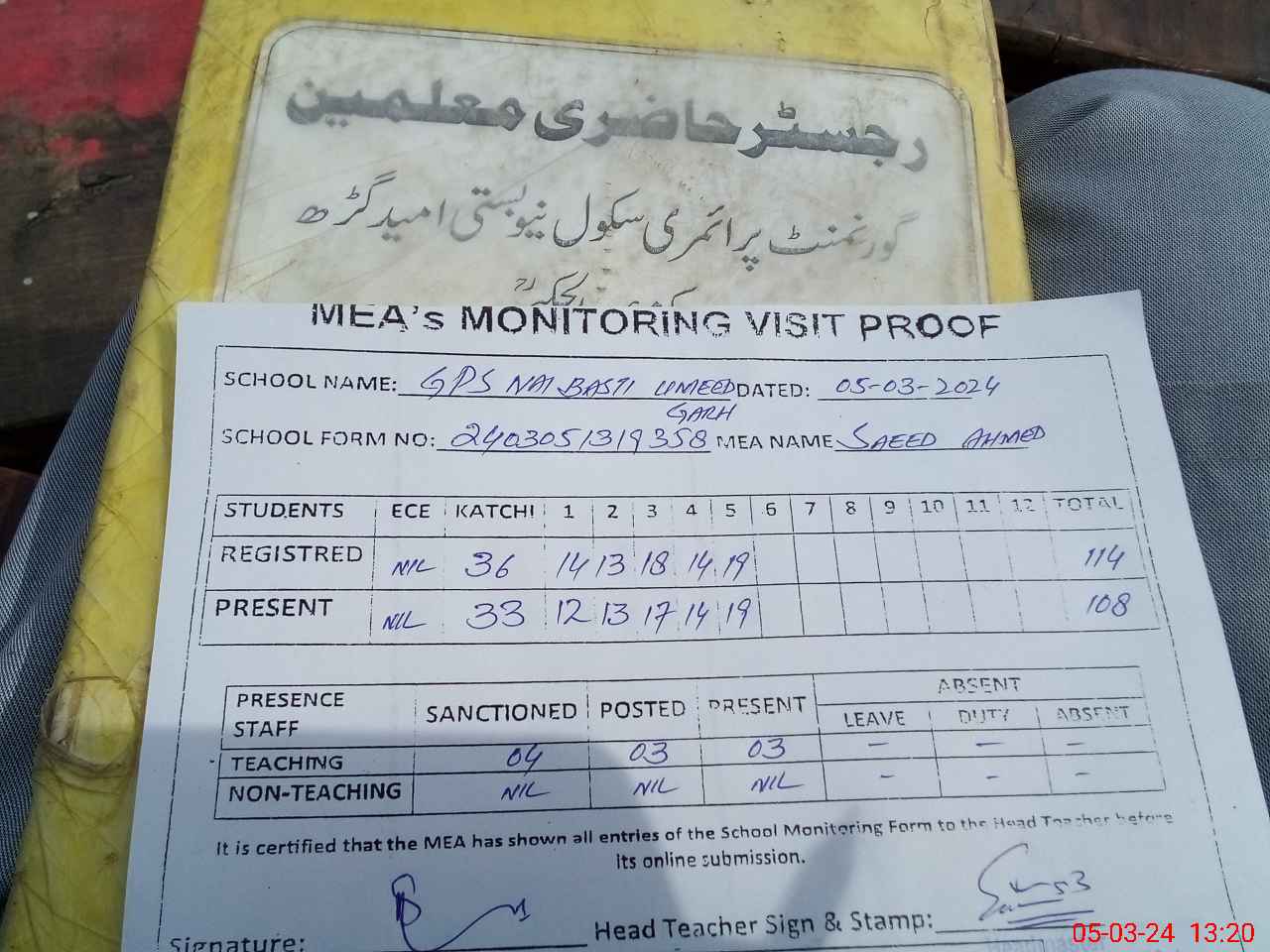 | Attendance Register | Head Teacher | MEA with School | Visit Proof |