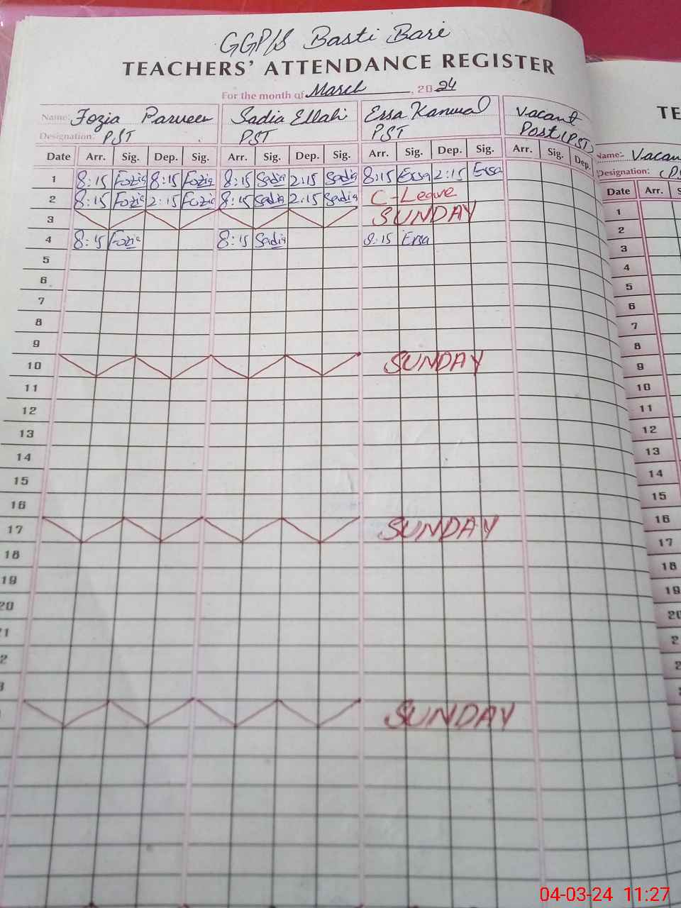 | Leave | Duty | Absent | Maternity | Medical | Ex- Pak |