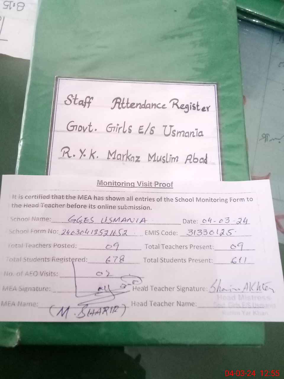 | Attendance Register | Head Teacher | MEA with School | Visit Proof |
