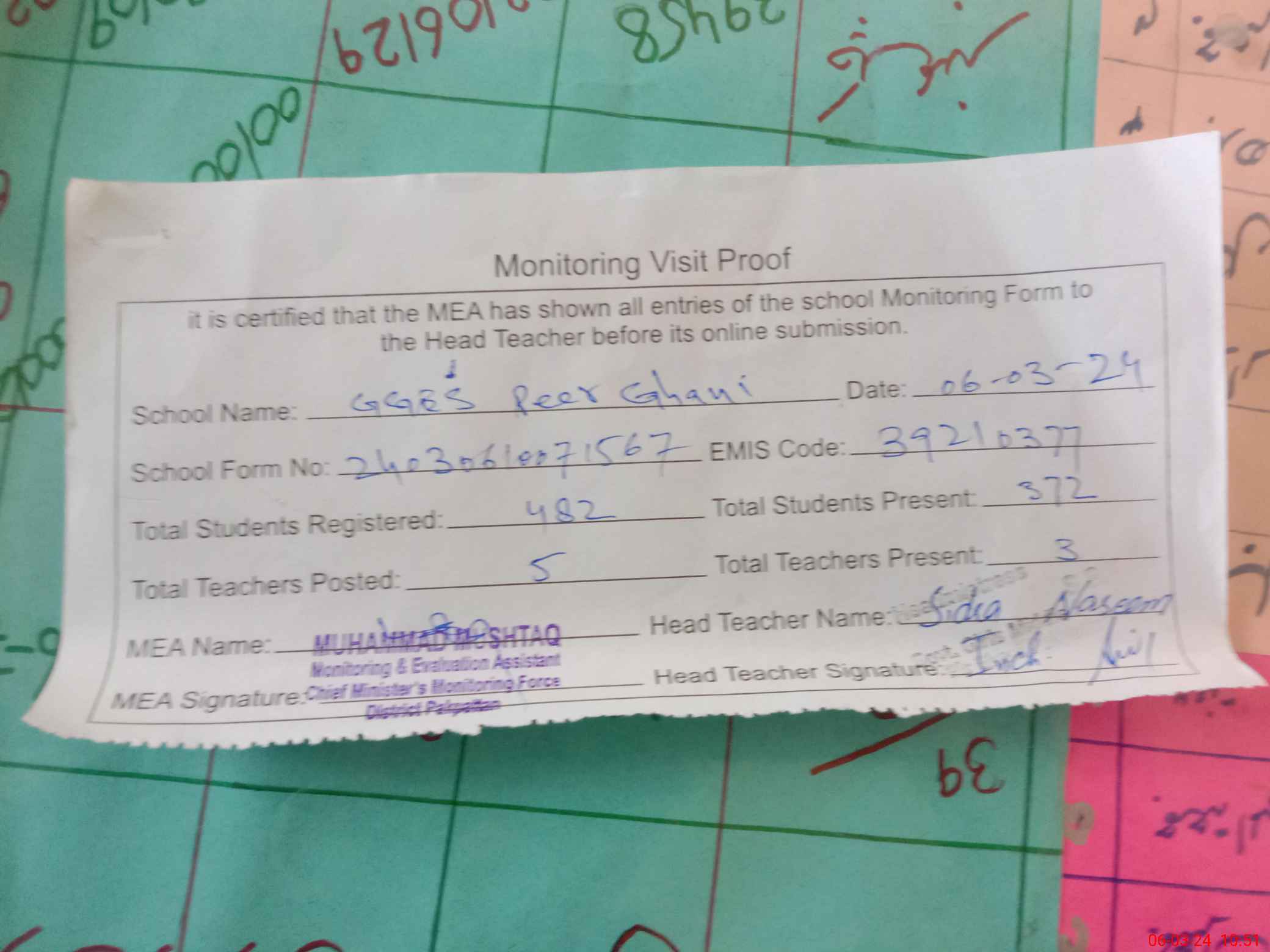 | Attendance Register | Head Teacher | MEA with School | Visit Proof |