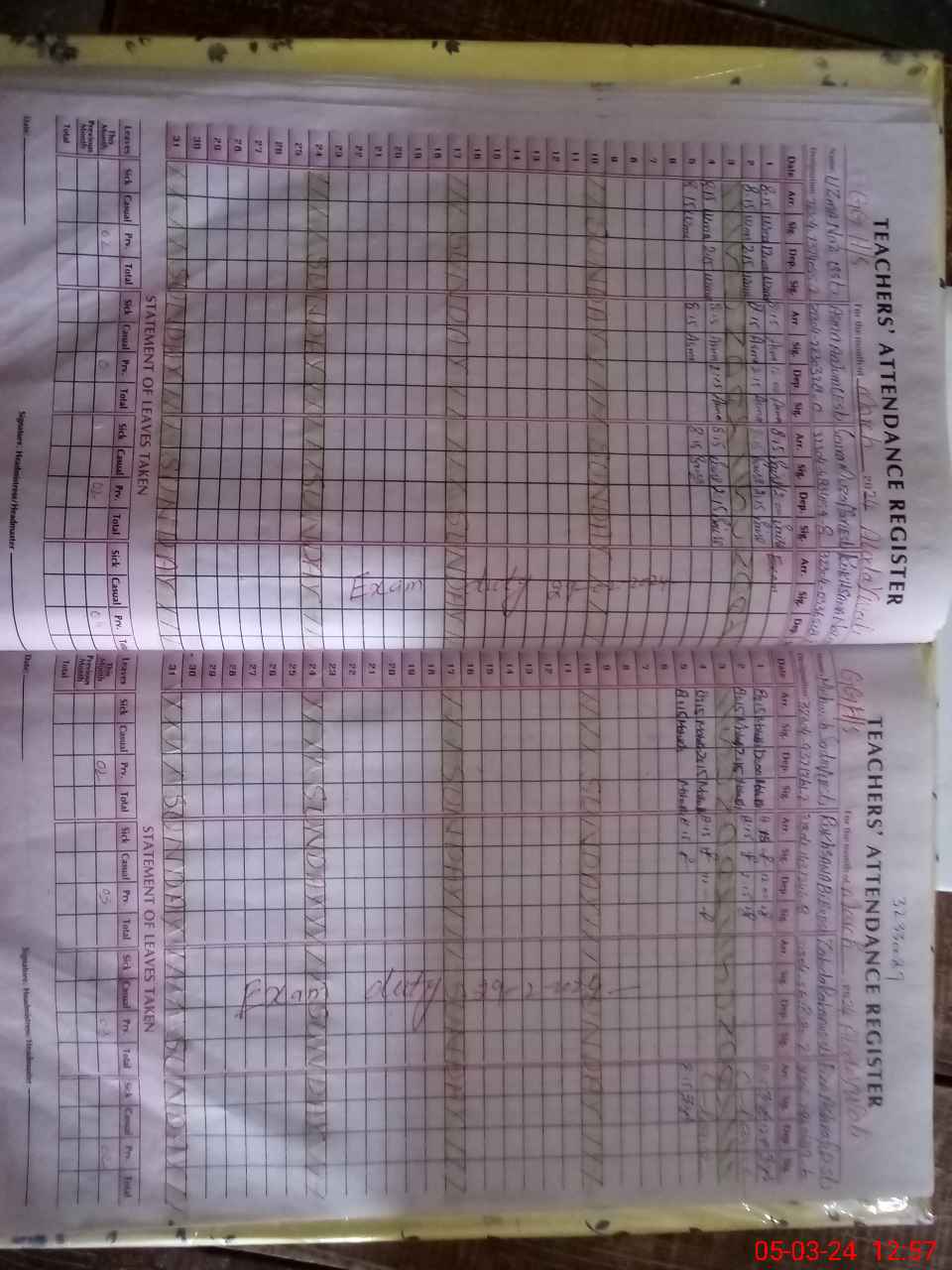 | 32**** | Ru**** Na**** | 3 | 1 | 0 | 0 | 0 | 0 | 0 | 0 | 0 | 0 | 0 | Exam Duty |