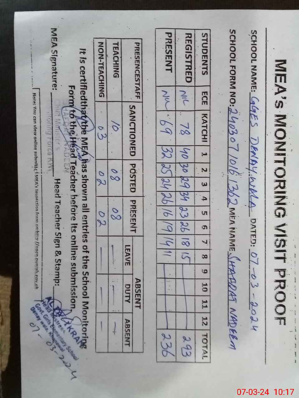 | Certified that this School was Inspected by the Undersigned MEA/DMO Today and the Information Stated Above is as Per Record. | |||||