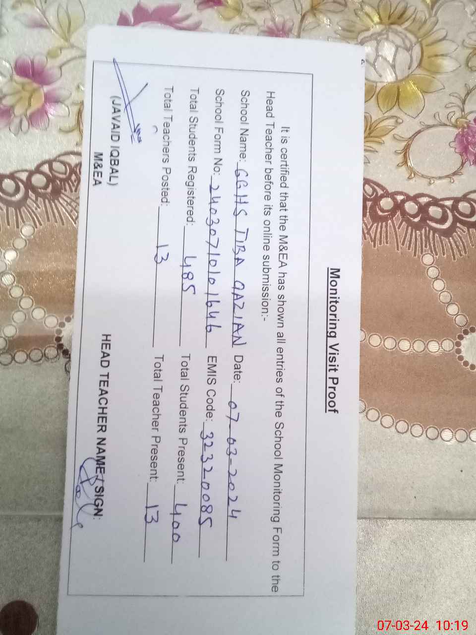 | Certified that this School was Inspected by the Undersigned MEA/DMO Today and the Information Stated Above is as Per Record. | |||||
