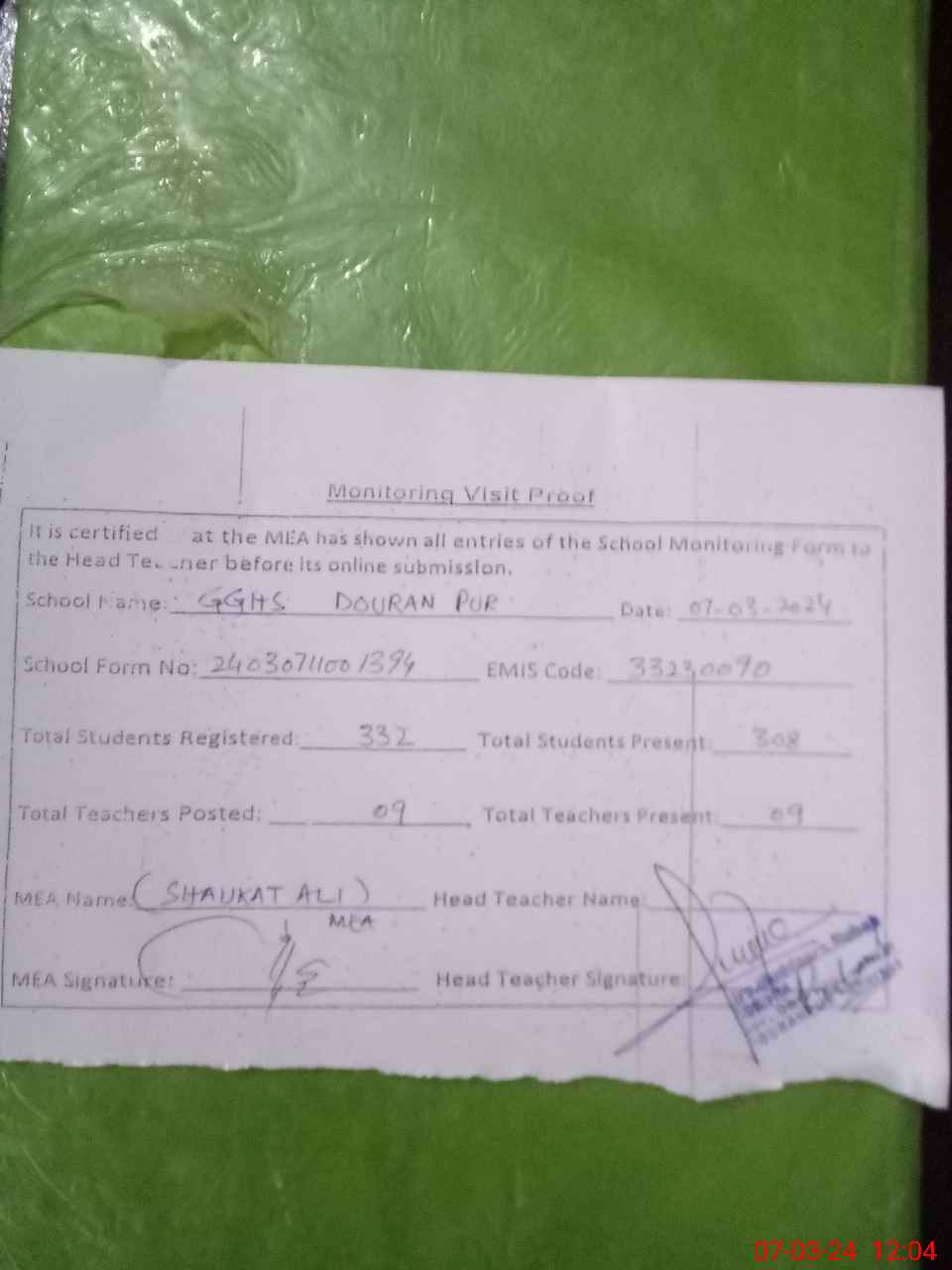 | Attendance Register | Head Teacher | MEA with School | Visit Proof |