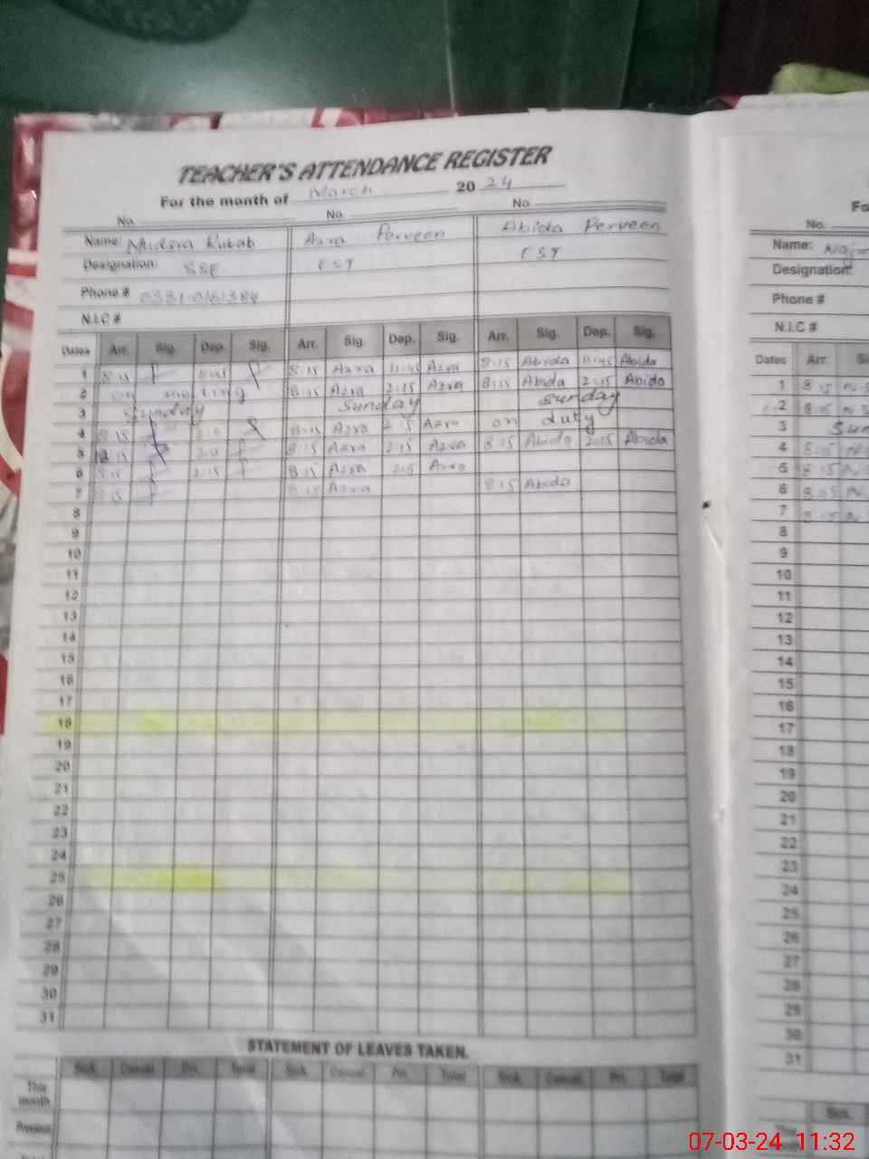 | CNIC | Full Name | Designation | R/C | Absence During Last Calender Month |