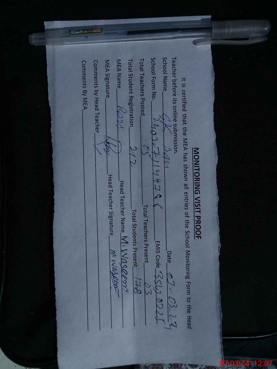 | Attendance Register | Head Teacher | MEA with School | Visit Proof |