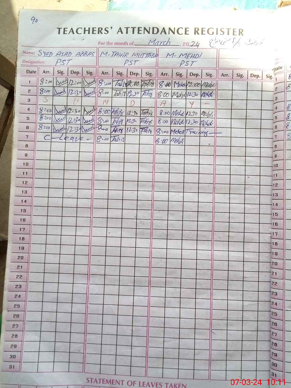 | Name: Mu**** Ir**** Designation: (School Headmaster's/Headmistress's) PST Phone/Cell Number: 03**** |