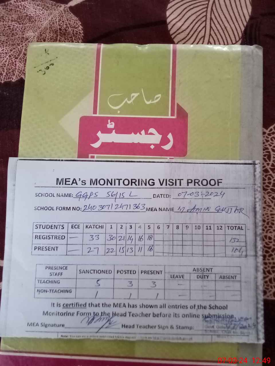 | Attendance Register | Head Teacher | MEA with School | Visit Proof |