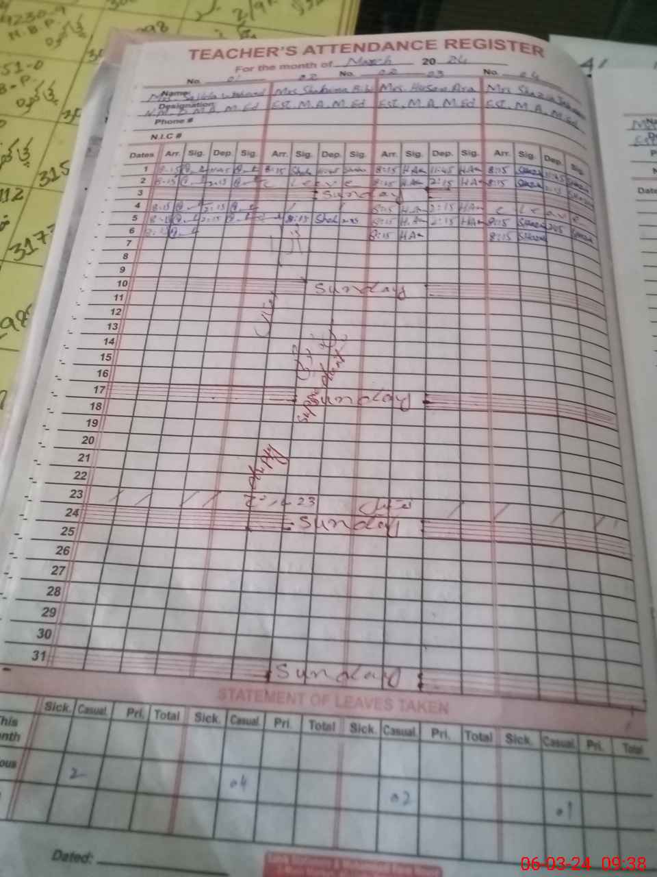 | 32**** | Ri**** Ak**** | 1 | 6 | 0 | 0 | 0 | 0 | 0 | 0 | 0 | 6 | Exam Duty | |