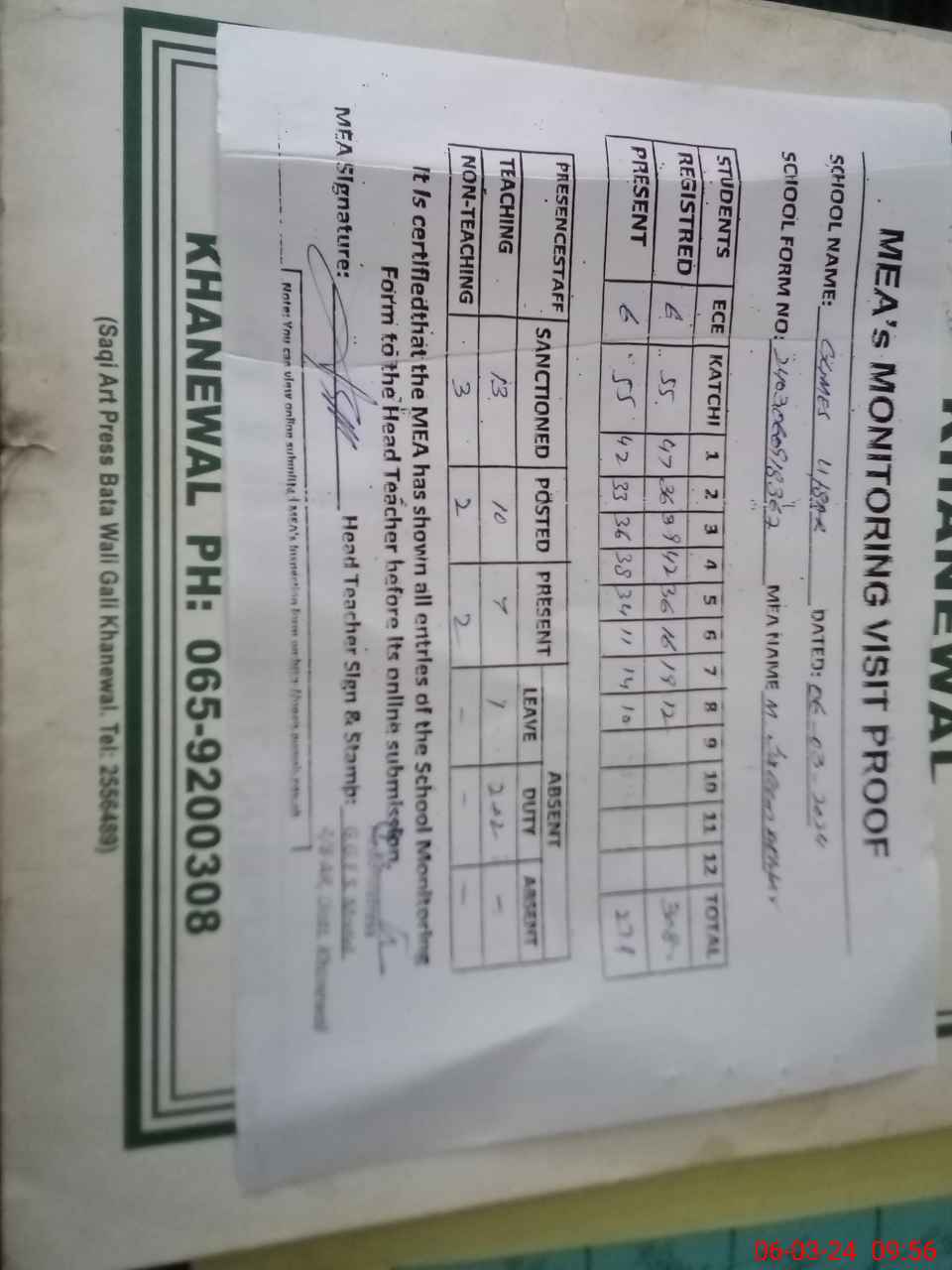 | Attendance Register | Head Teacher | MEA with School | Visit Proof |