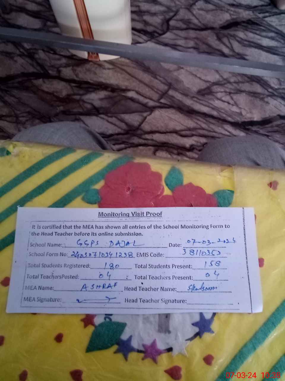 | Attendance Register | Head Teacher | MEA with School | Visit Proof |