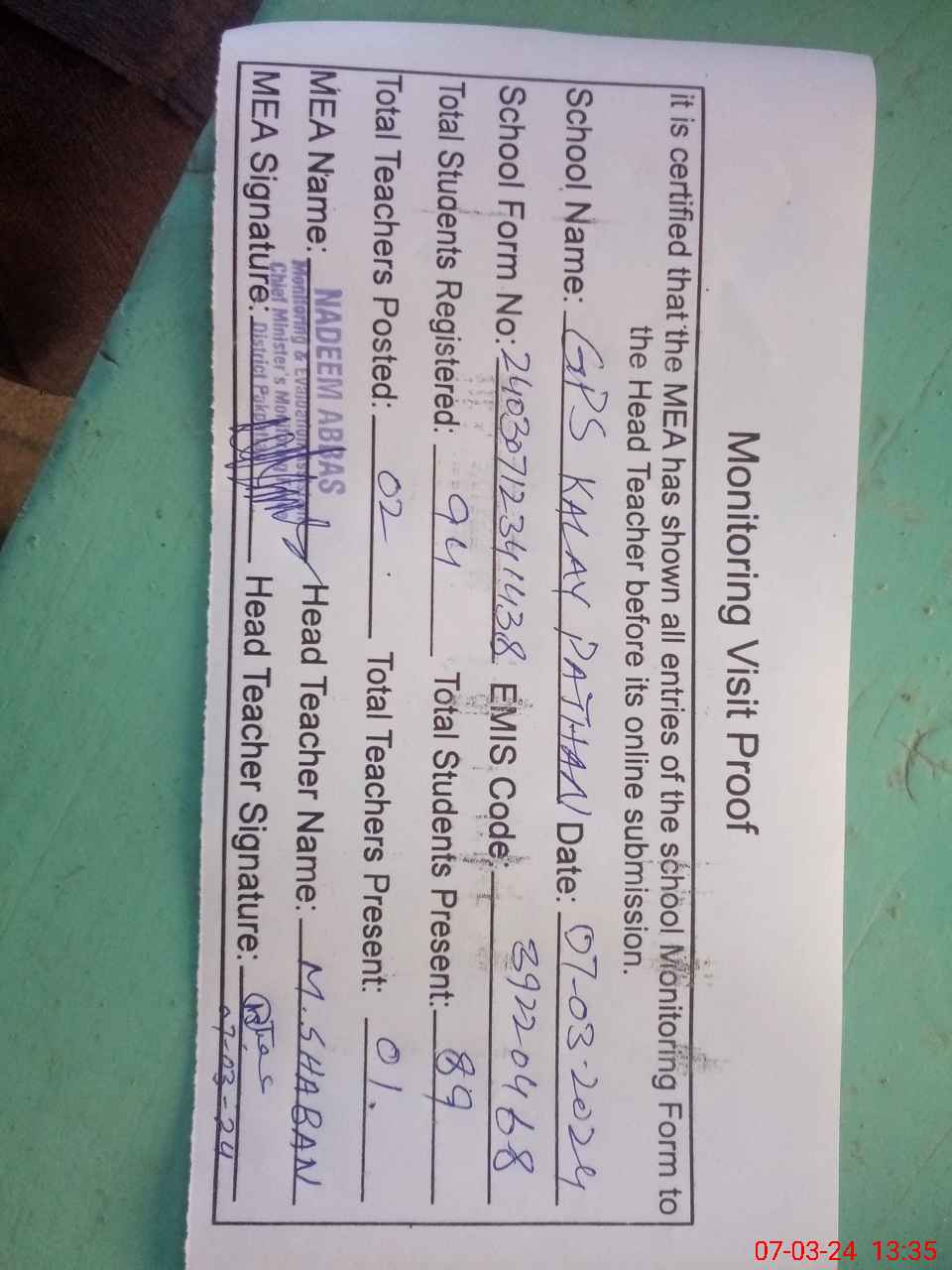 | Attendance Register | Head Teacher | MEA with School | Visit Proof |