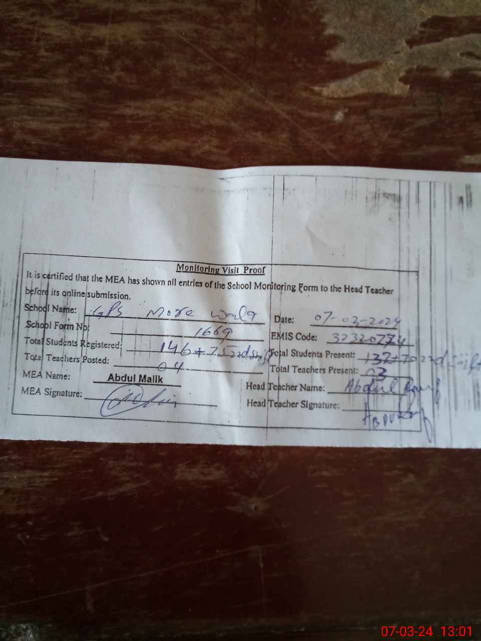 | EMIS Code: 32320274 | Name of School: GPS MORE WALA | |||