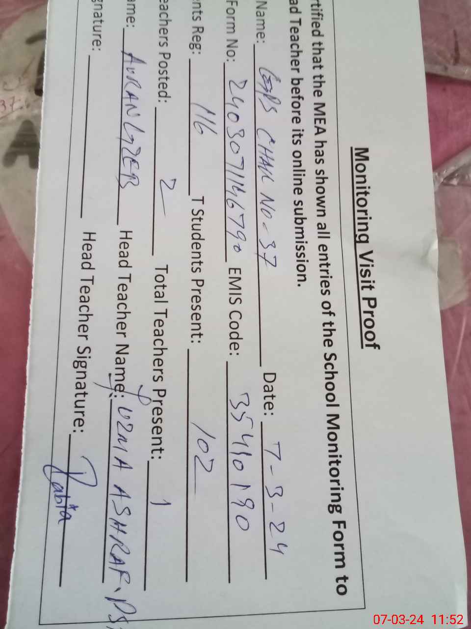 | Name: uz**** As**** Designation: (School Headmaster's/Headmistress's) Pst Phone/Cell Number: 03**** |