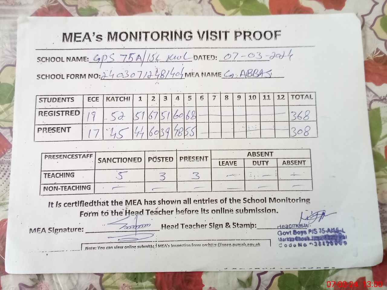 | Certified that this School was Inspected by the Undersigned MEA/DMO Today and the Information Stated Above is as Per Record. | |||||
