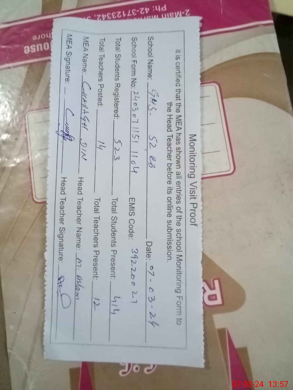 | Name: GU**** AH**** Designation: (School Headmaster's/Headmistress's) H.M Phone/Cell Number: 03**** |