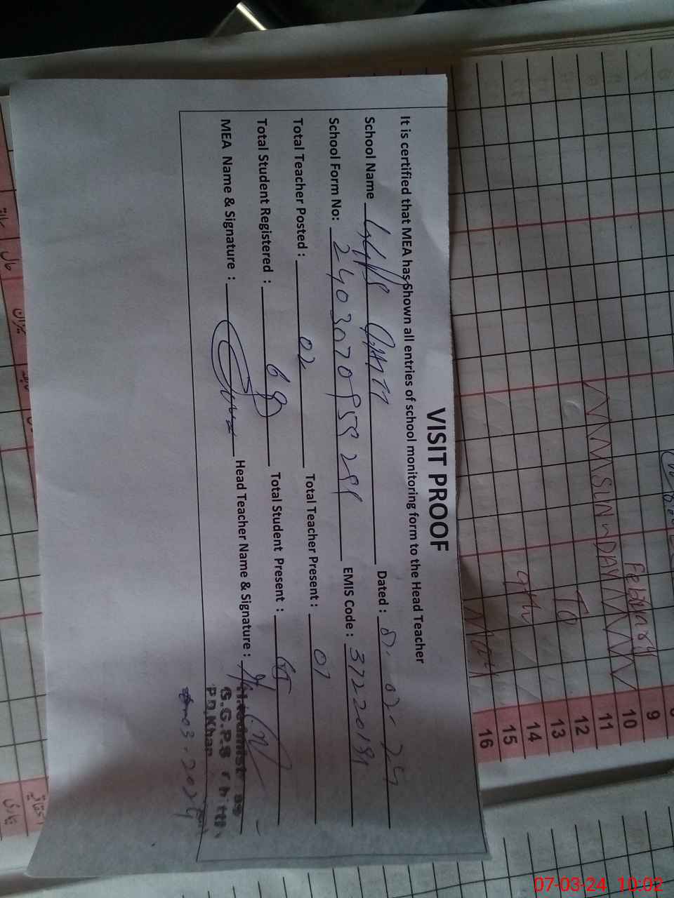 | Attendance Register | Head Teacher | MEA with School | Visit Proof |