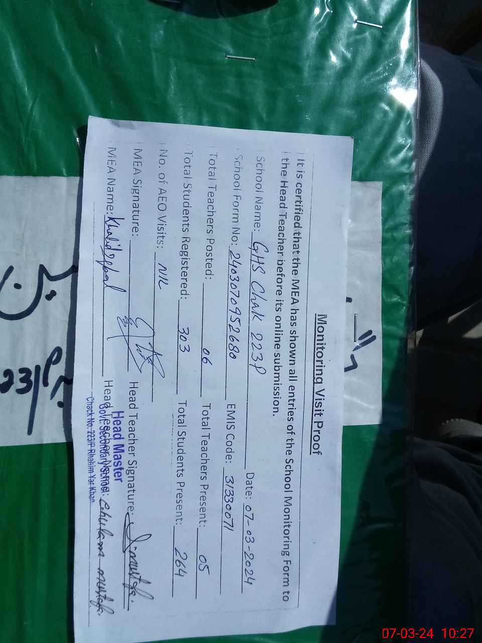| EMIS Code: 31330071 | Name of School: GHS CHAK NO. 223/P | |||