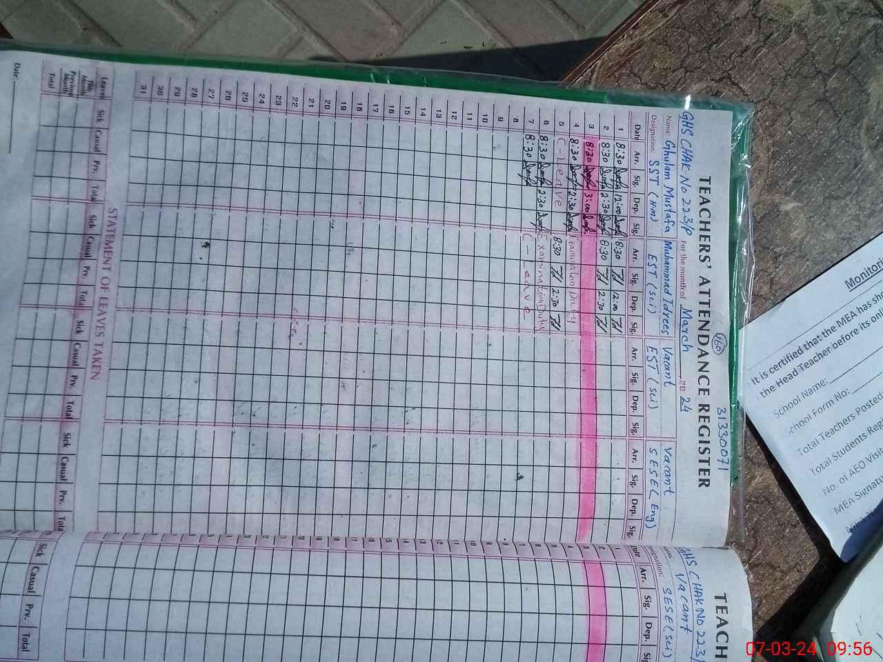 | Attendance Register | Head Teacher | MEA with School | Visit Proof |