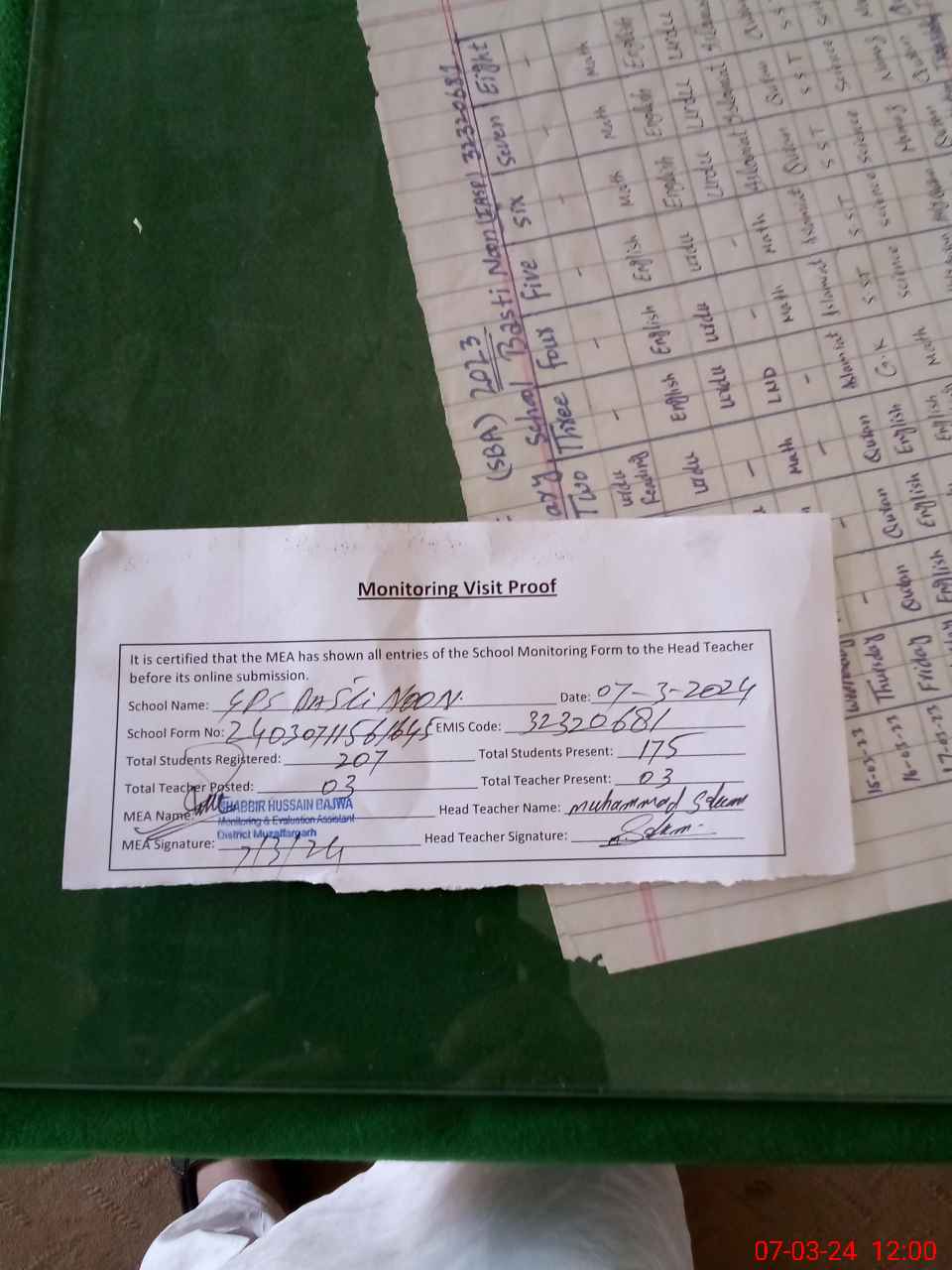 | Attendance Register | Head Teacher | MEA with School | Visit Proof |